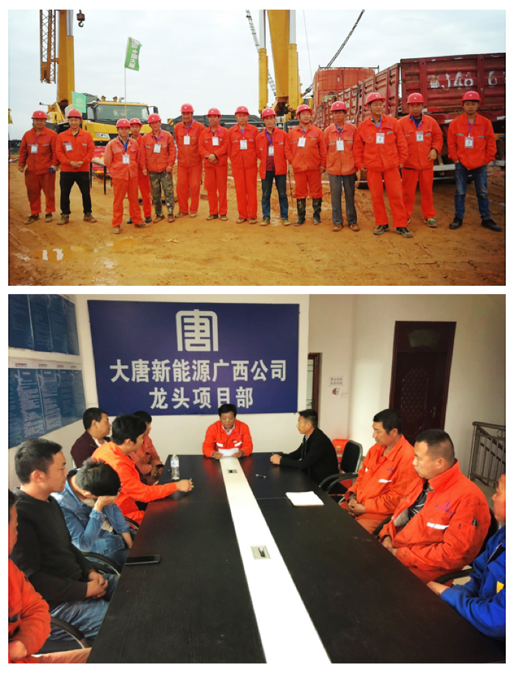 我方选用徐工QAY1000T作为主吊,徐工75T和长江70T作为辅吊,主吊于5月1日在39#机位开始组车,5月3日主吊组装完成,因当地气候原因,正处于雨季,机位平台因雨水浸泡处于松散泥泞状态,吊车在平台行走和支车艰难,为确保现场施工顺利进行,项目部积极对施工现场人员配备、材料需求、机械需求等方面进行全面梳理,实时掌握施工过程中总体情况,确保现场进度实现可控、能控、在控。我方克服种种困难仅用4天时间于5月13日顺利完成首次风机吊装。